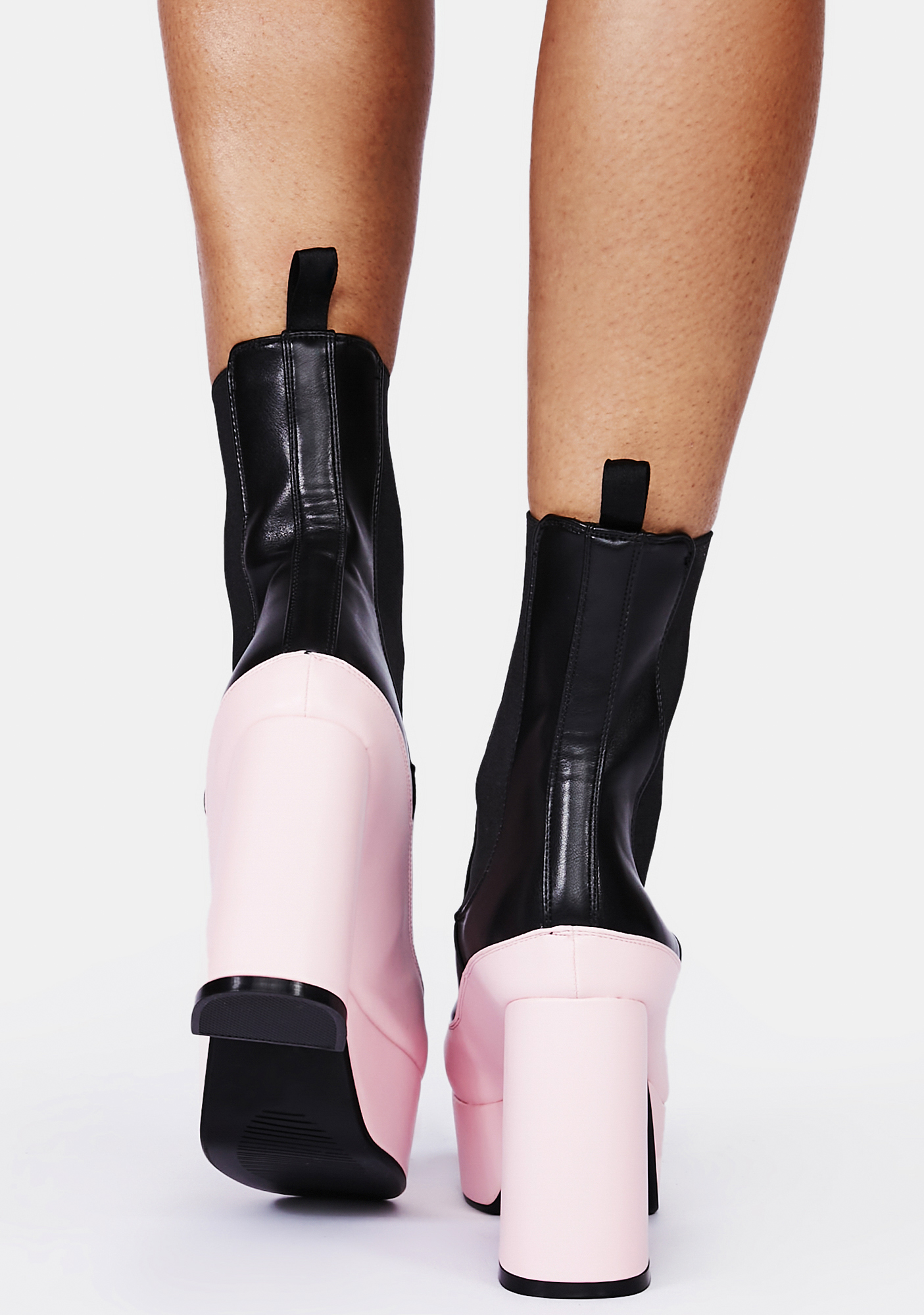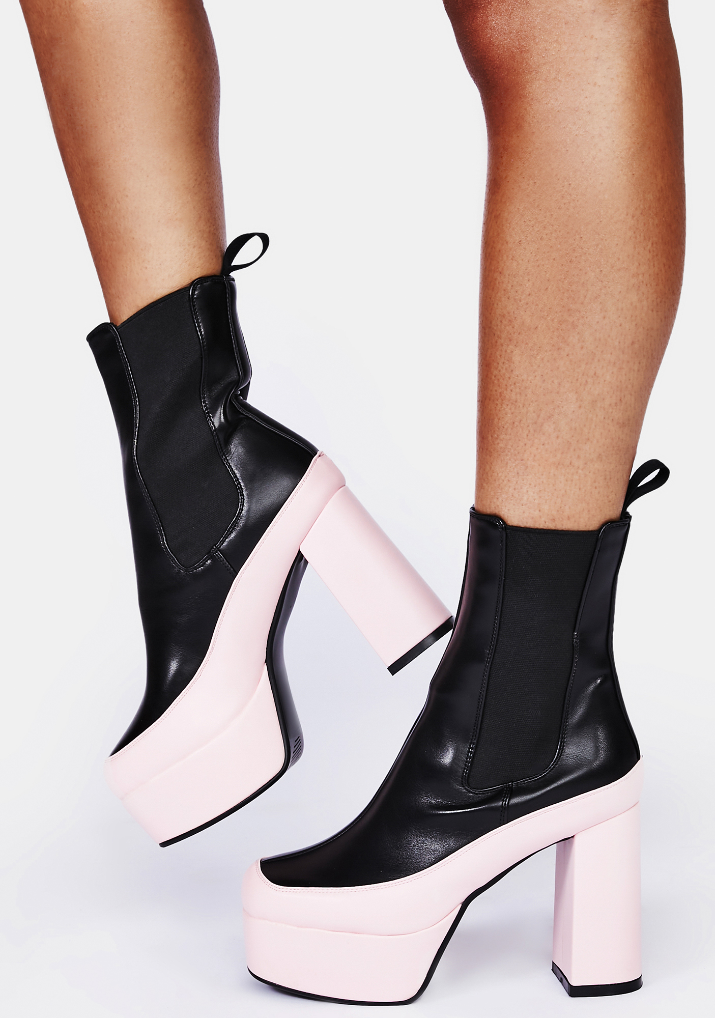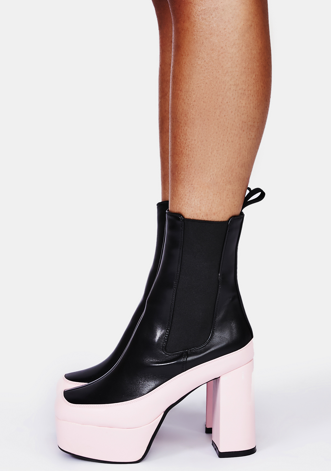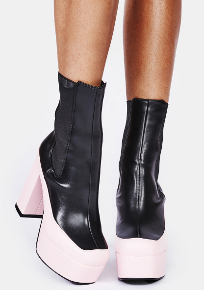Best Of Both Worlds Chelsea Boots cuz when you’re famous it can be kinda fun! These two-tone chelsea boots have a vegan leather construction, platform soles with chunky block heels, and elastic side gussets for a fitted look.