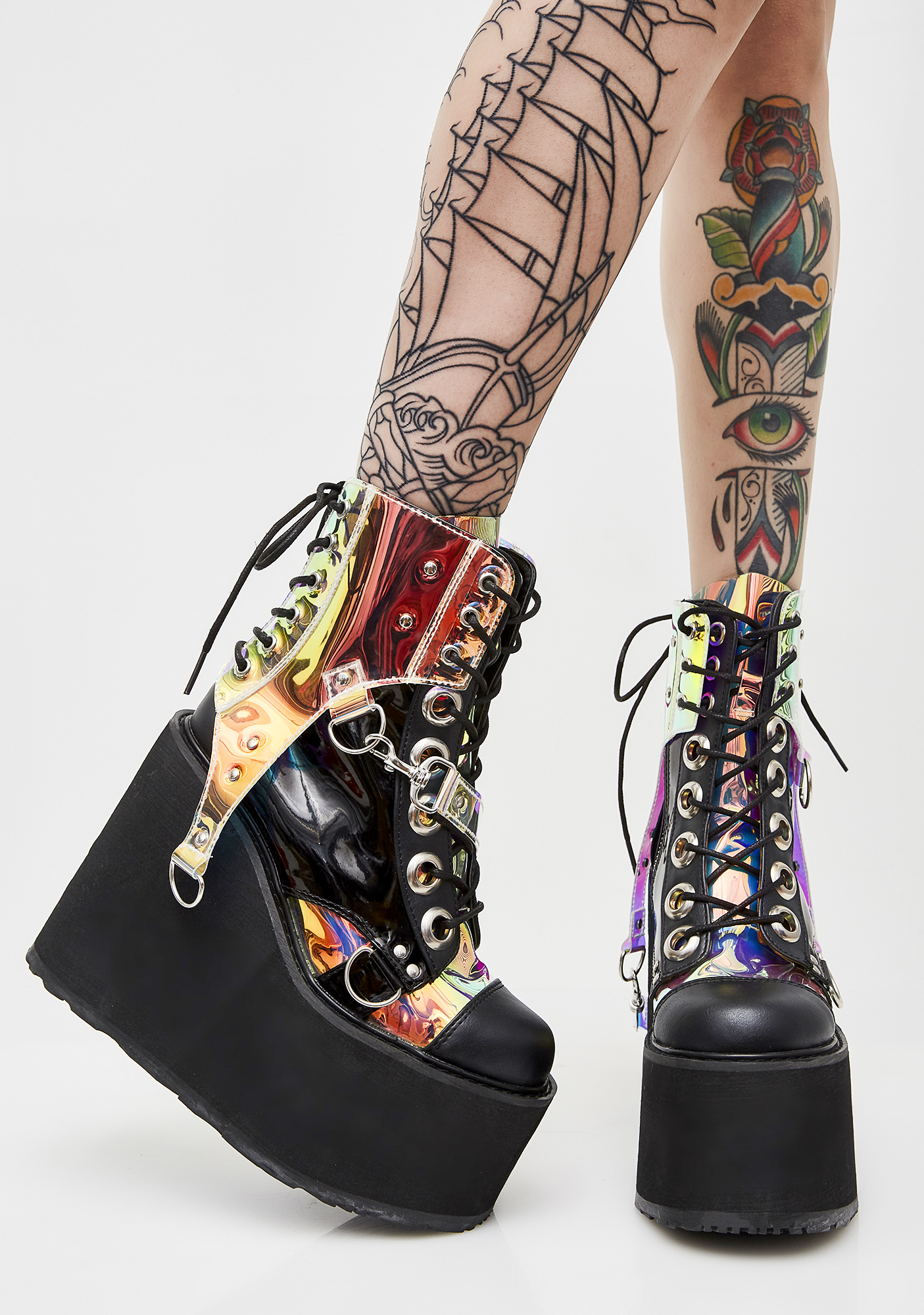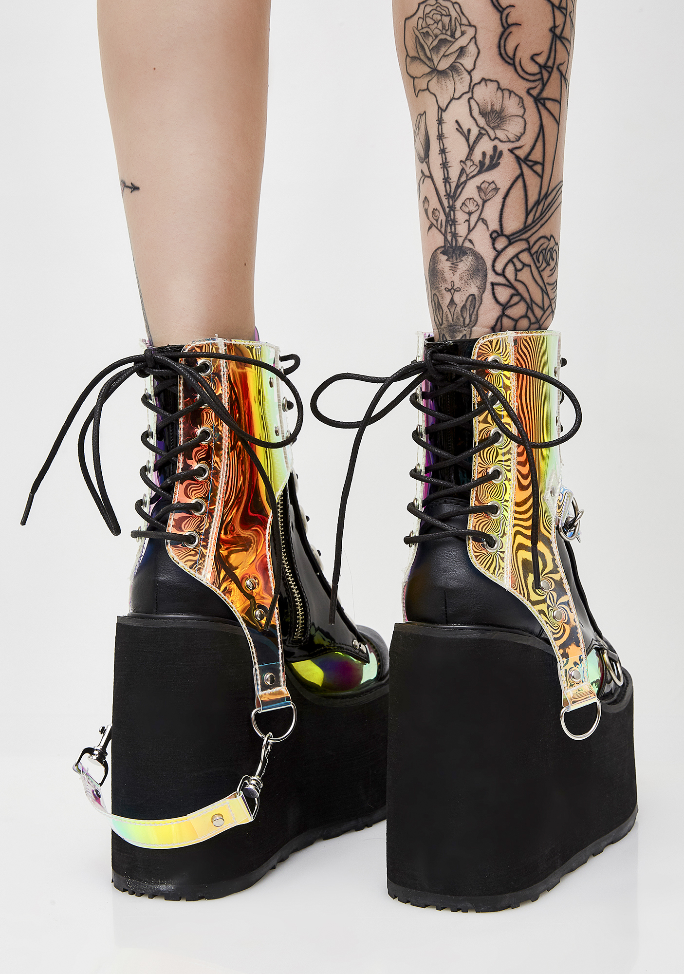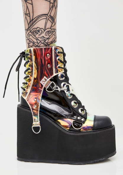 Black Hole Platform Boots got ya out in deep space. These sikk af iridescent boots have thikk platform soles, lace-ups on the front N’ back, and clip-on strap details.