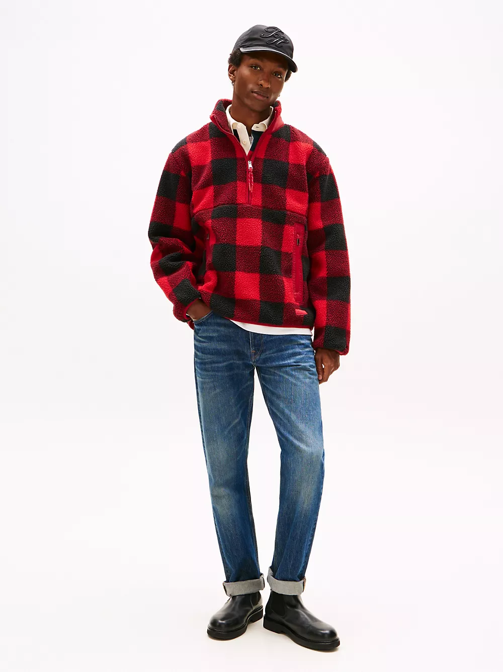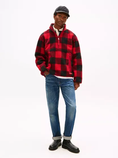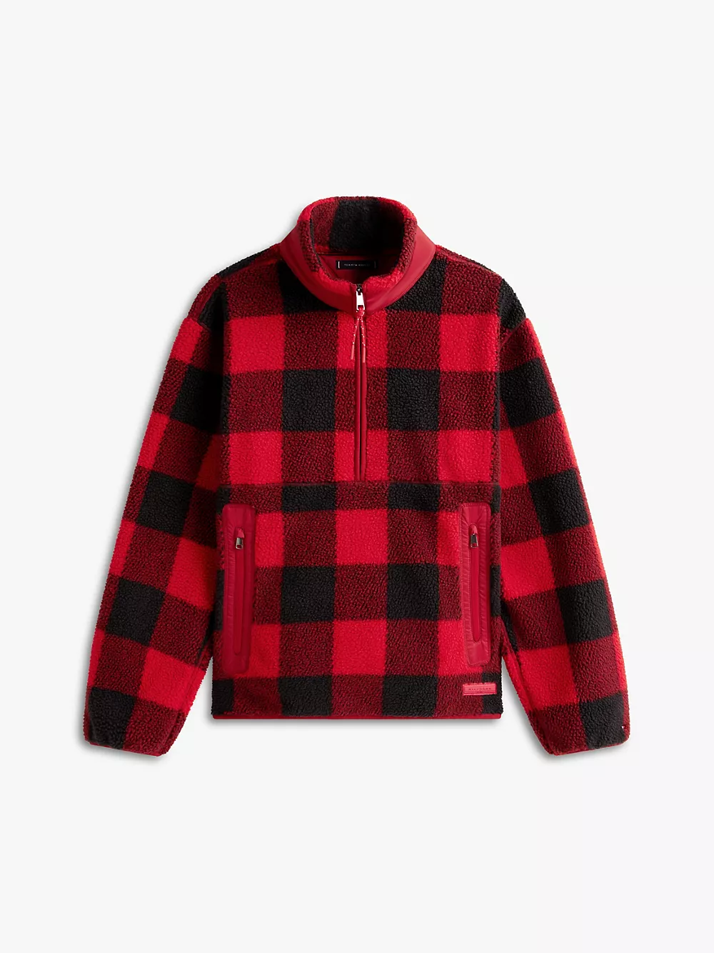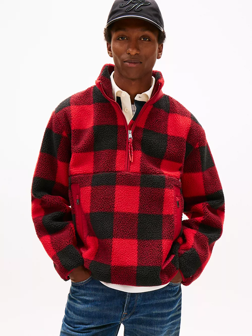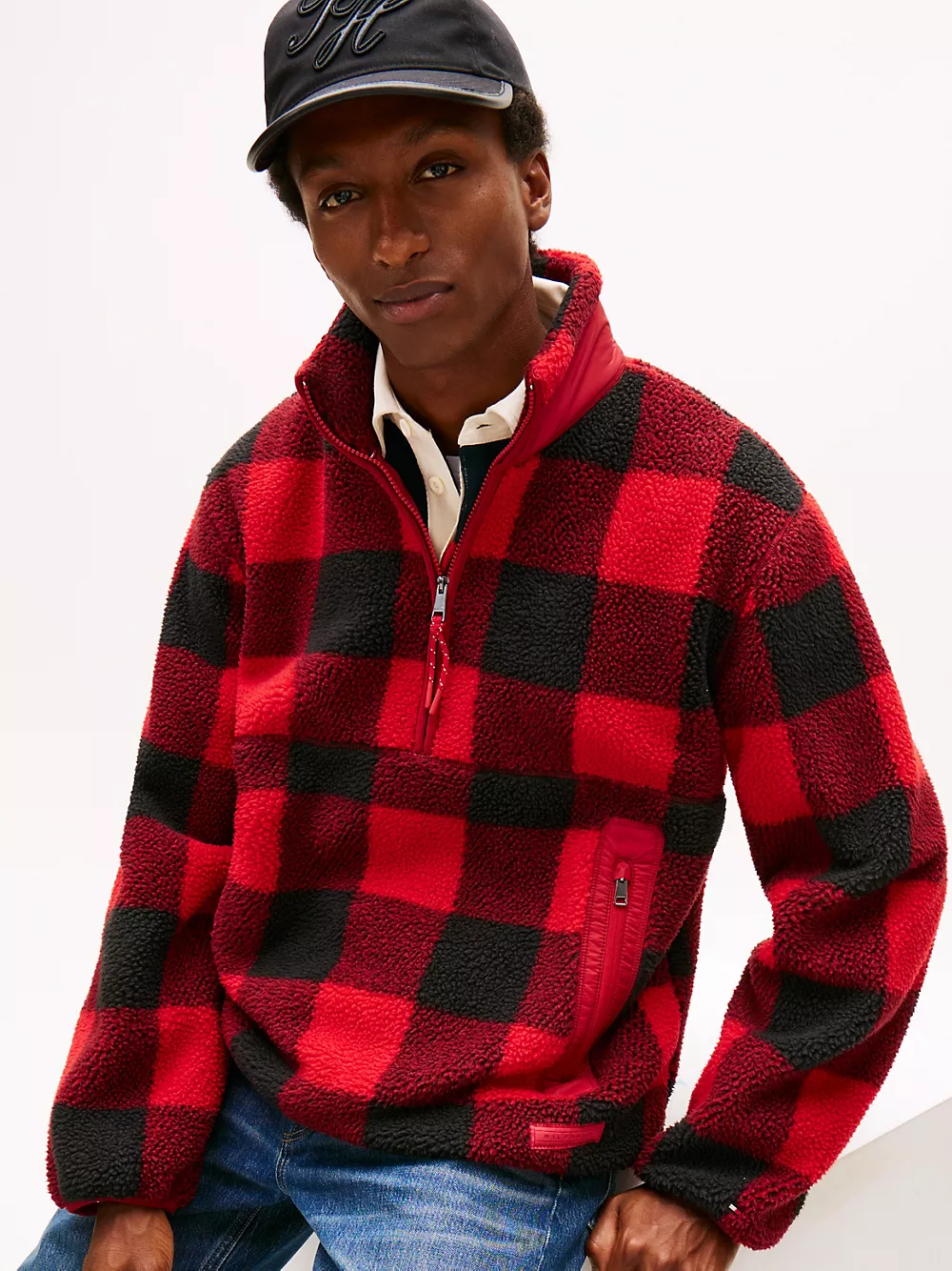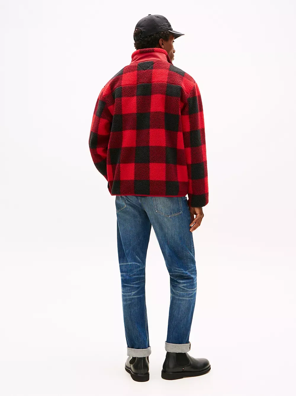 Tommy Hilfiger men's jacket. Add a layer of warmth with this cozy teddy fleece zip jacket, designed in a buffalo check print for on-point seasonal dressing.