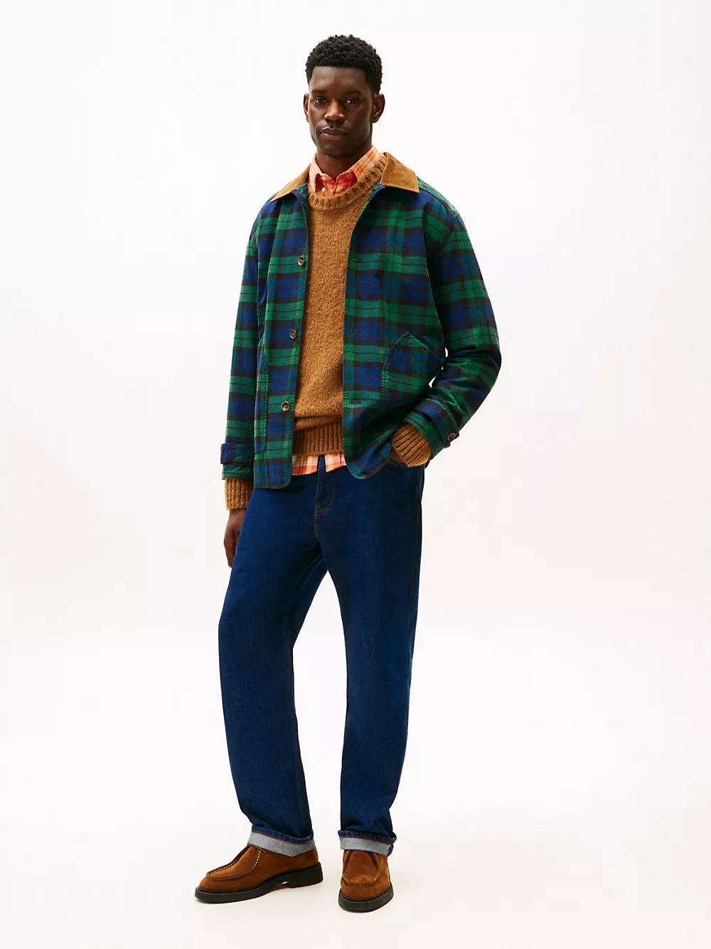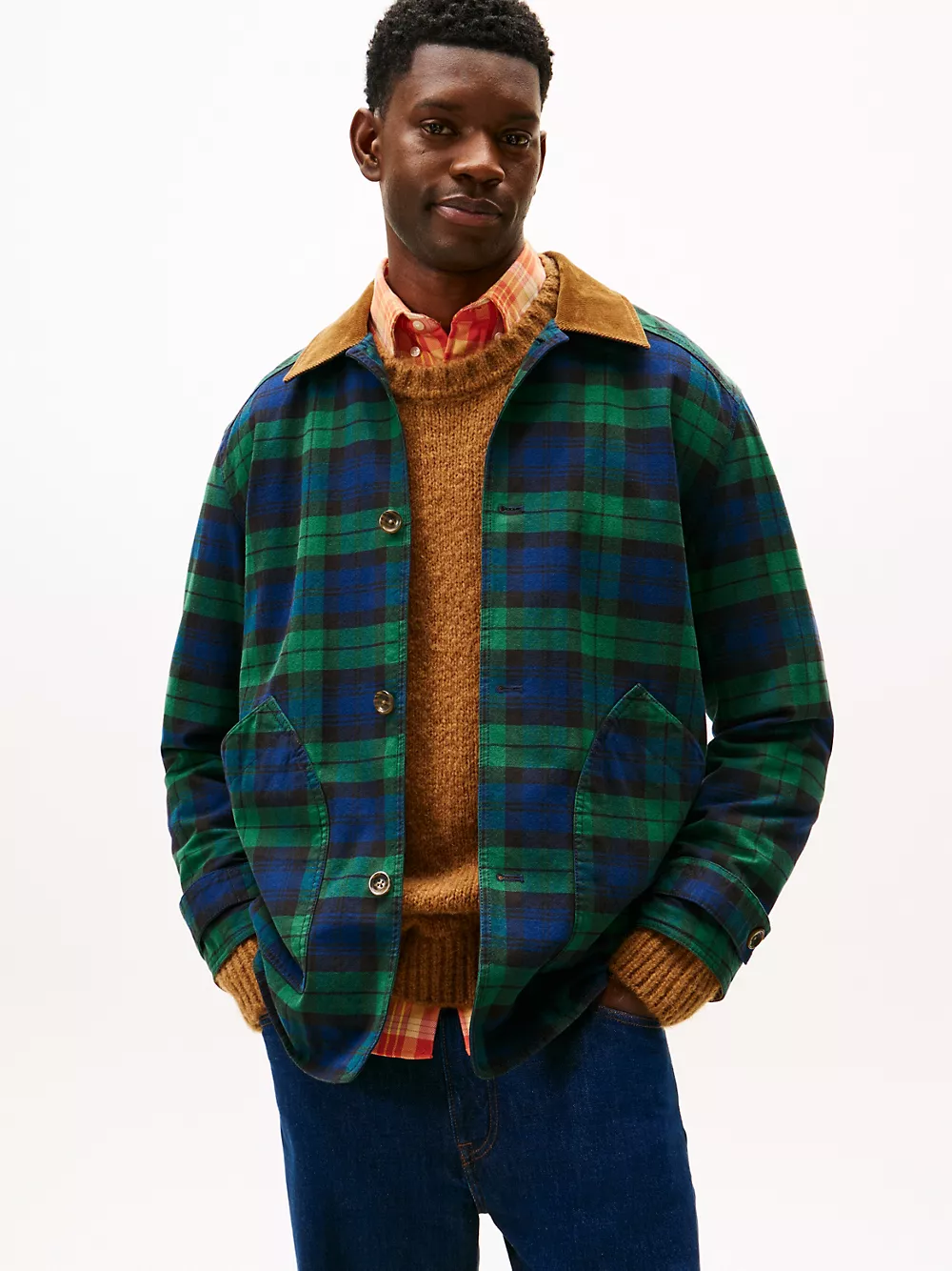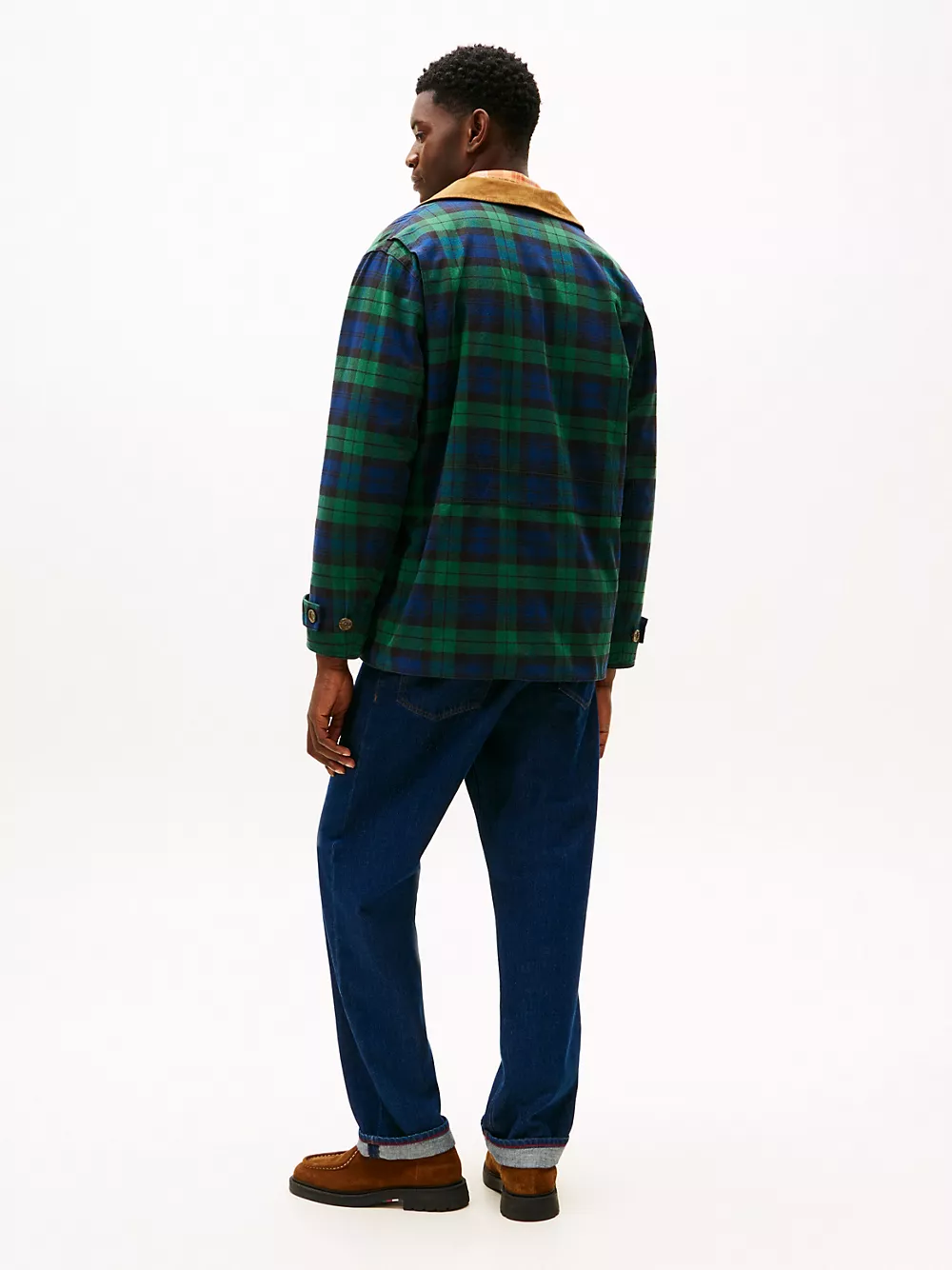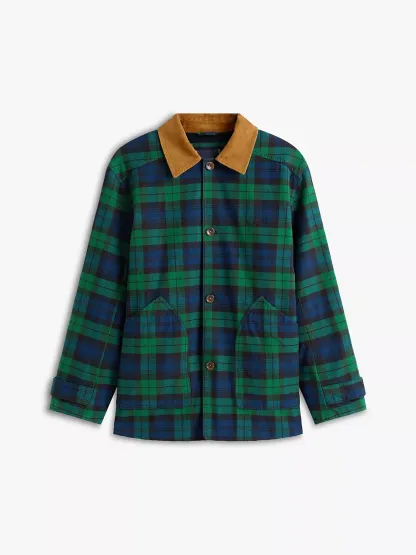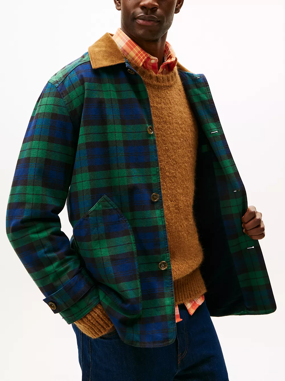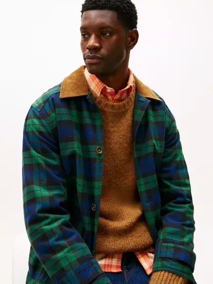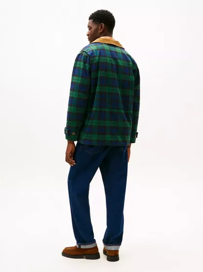 Tommy Hilfiger men's jacket. Inspired by the workwear staple, our barn jacket is designed with roomy patch pockets and a corduroy collar. Made from midweight cotton twill, it’s built to transition effortlessly through the seasons.