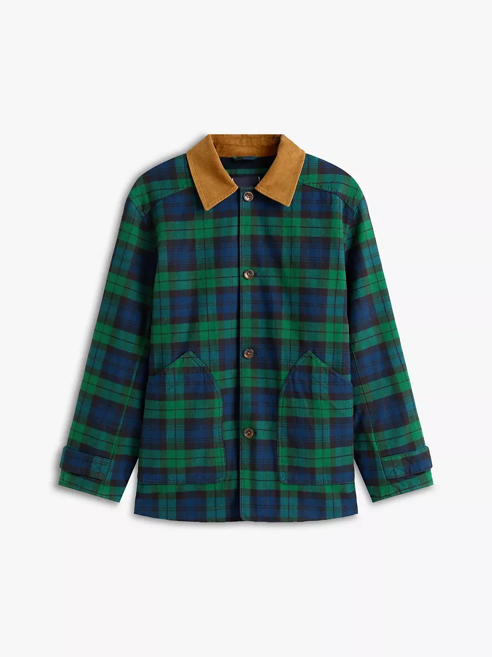 - Corduroy collar, button closure, patch pockets.
