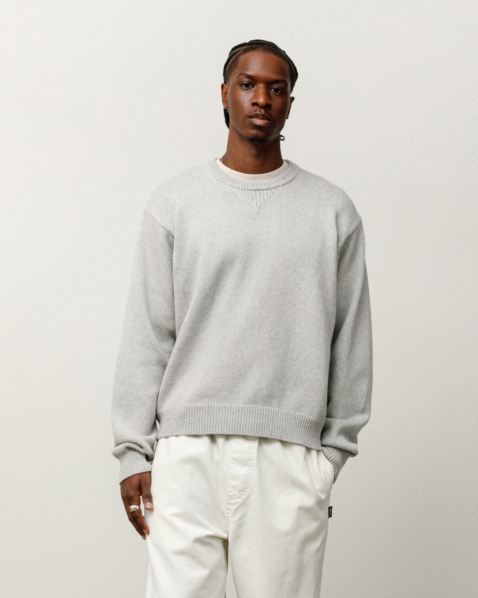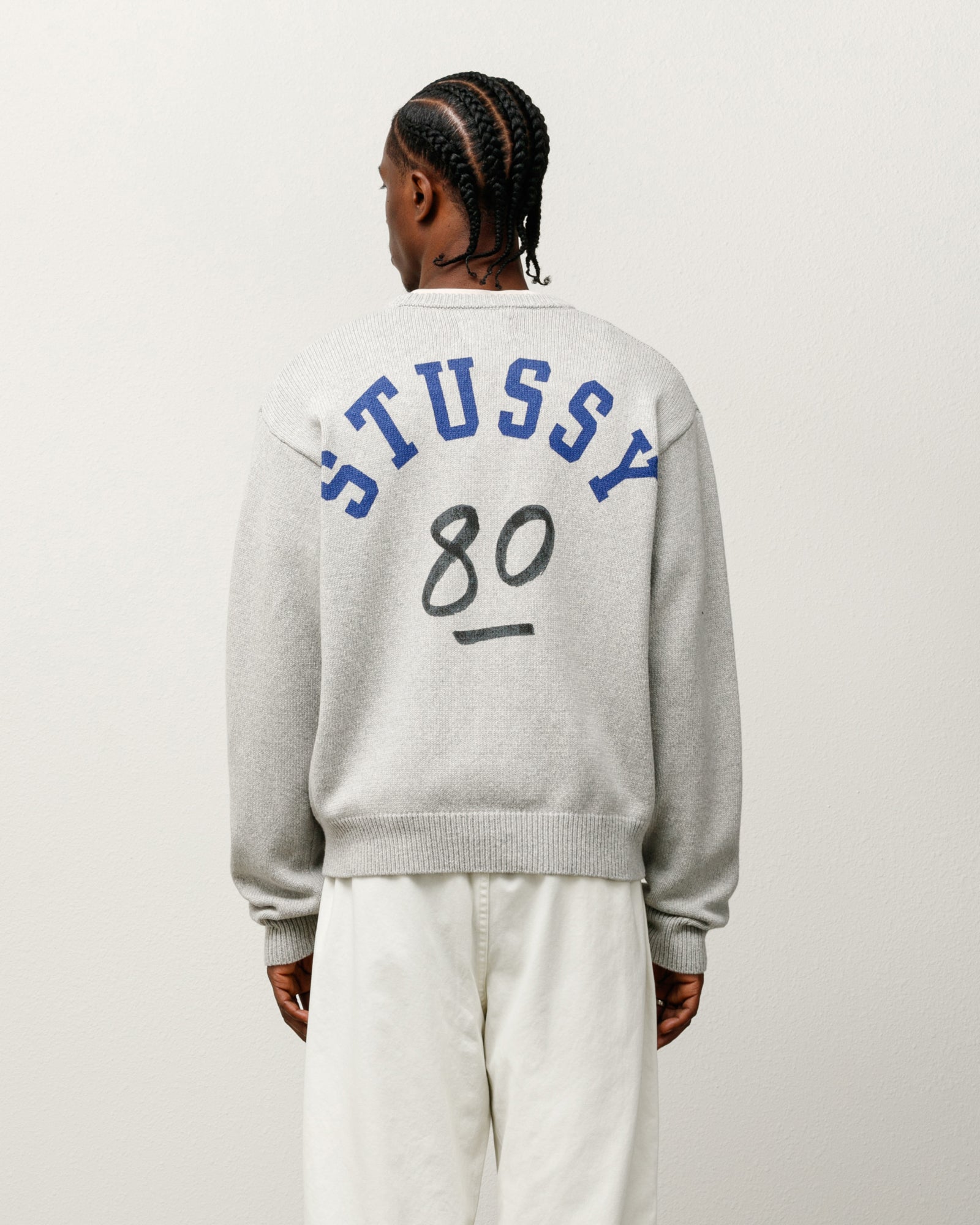 Relaxed fit sweater in a superfine merino and cotton blend knit. Stüssy artwork printed across the back.