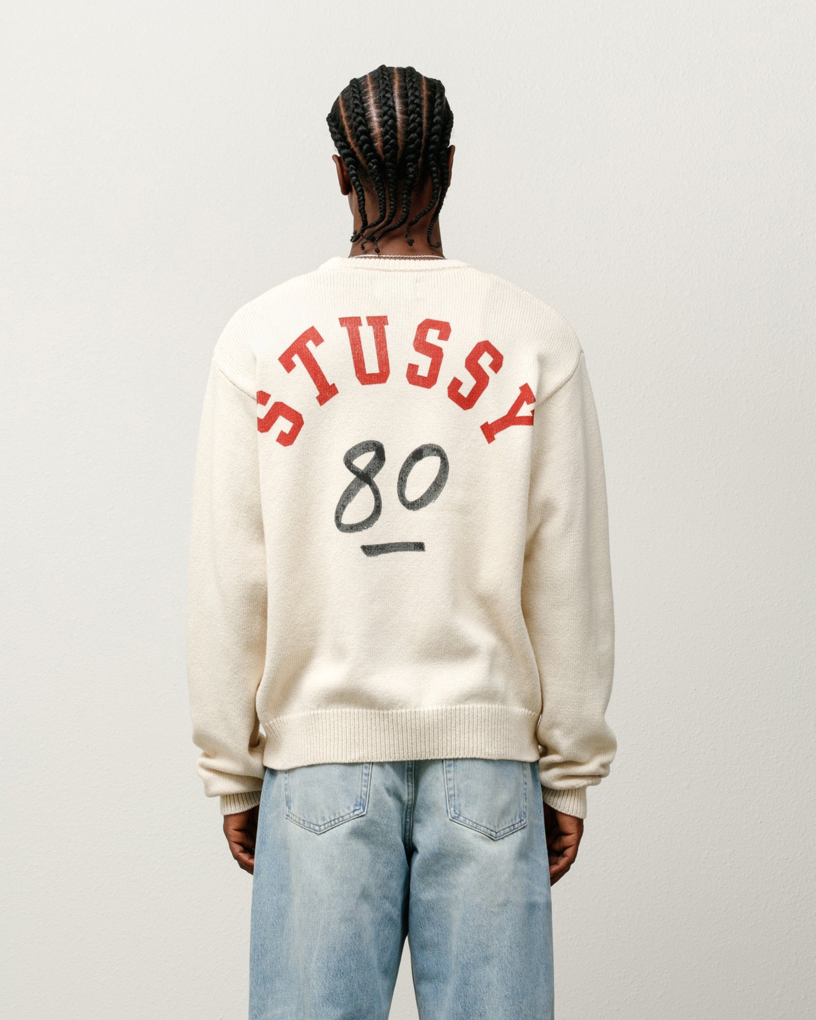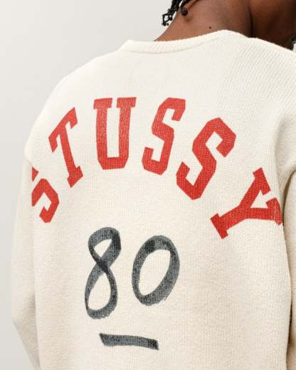 Relaxed fit sweater in a superfine merino and cotton blend knit. Stüssy artwork printed across the back.
