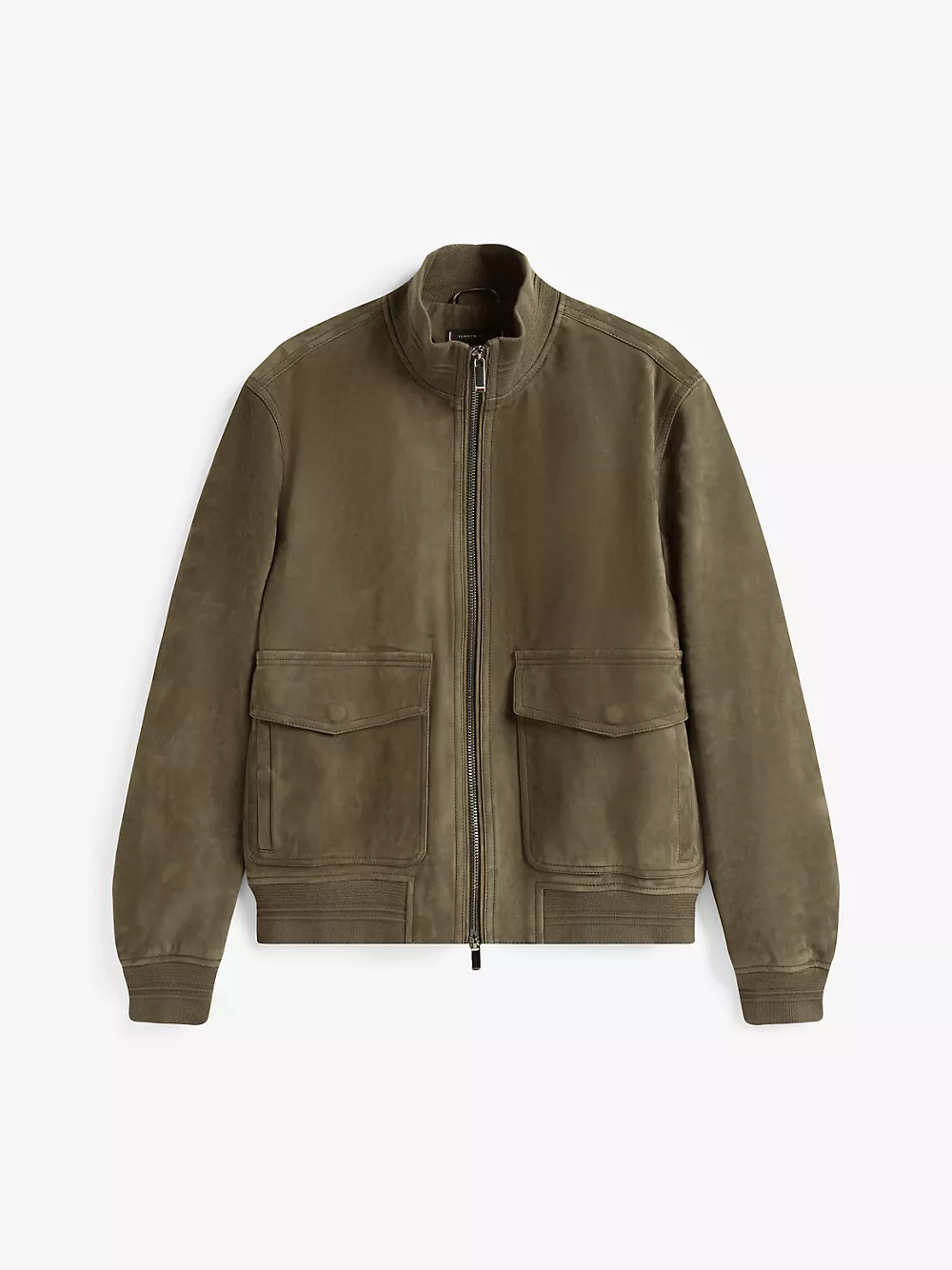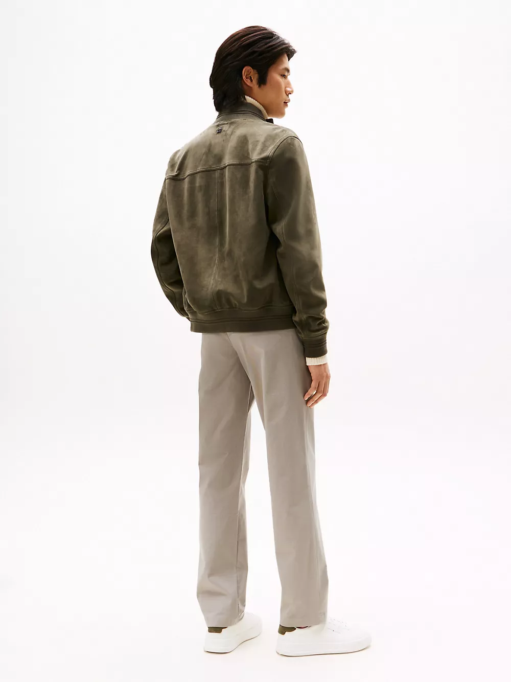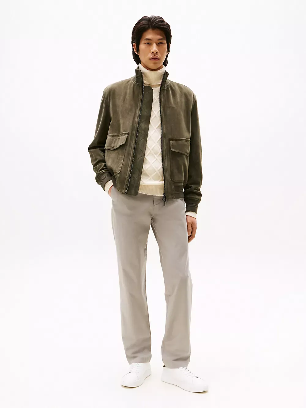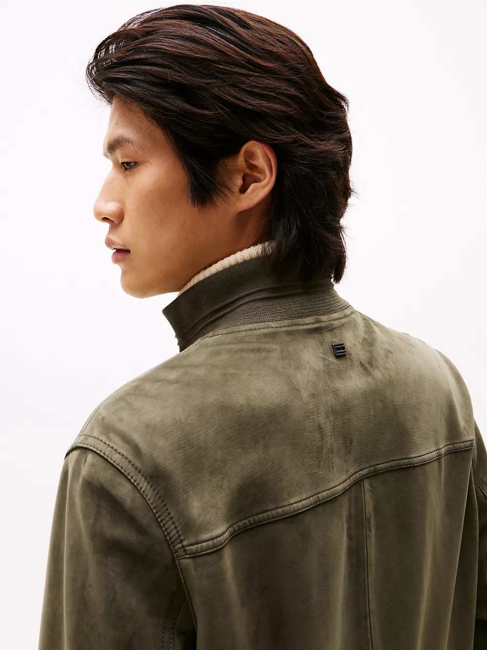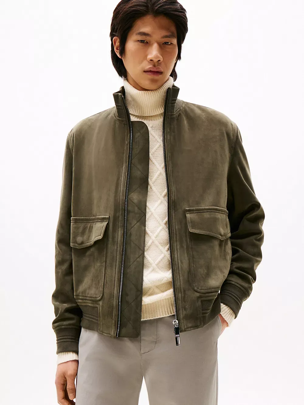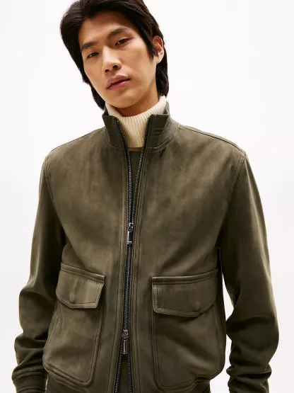 Tommy Hilfiger men's jacket. This effortlessly cool jacket is crafted from velvety nubuck leather with a soft, supple feel. It features a zip-front closure, large flap pockets, and comfortable rib-knit trim for a polished finish.