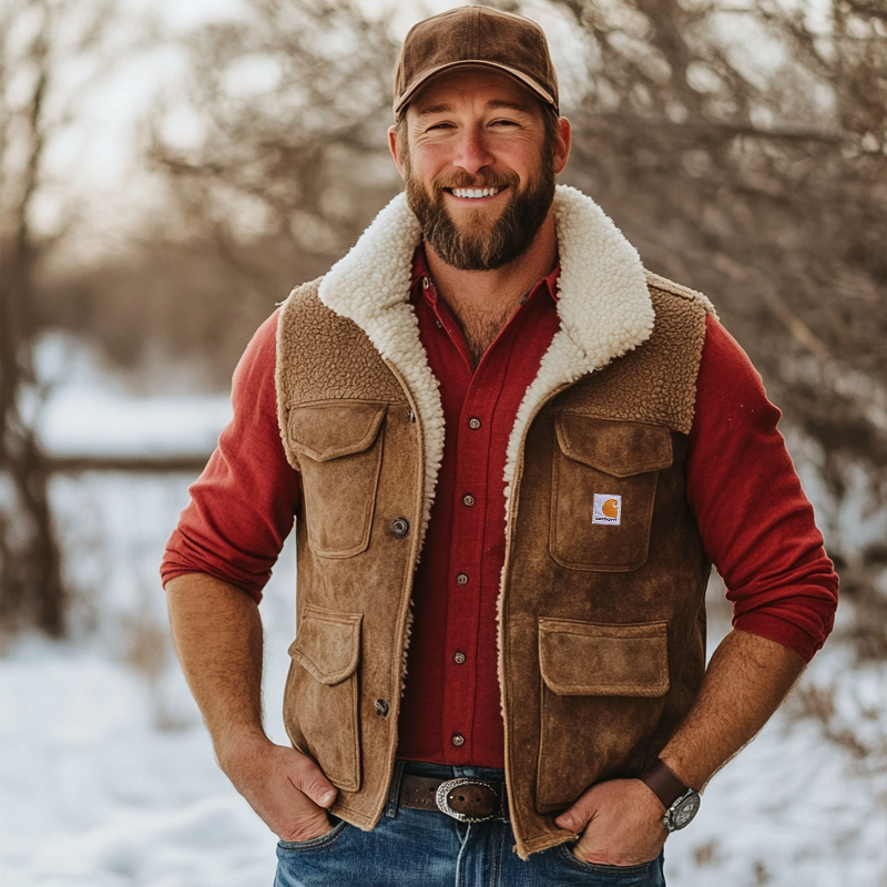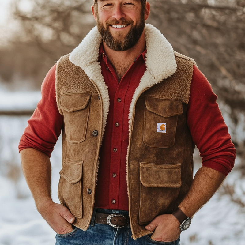 Men's Outdoor Vintage Lamb Wool Multi Pocket Suede Vest Jacket