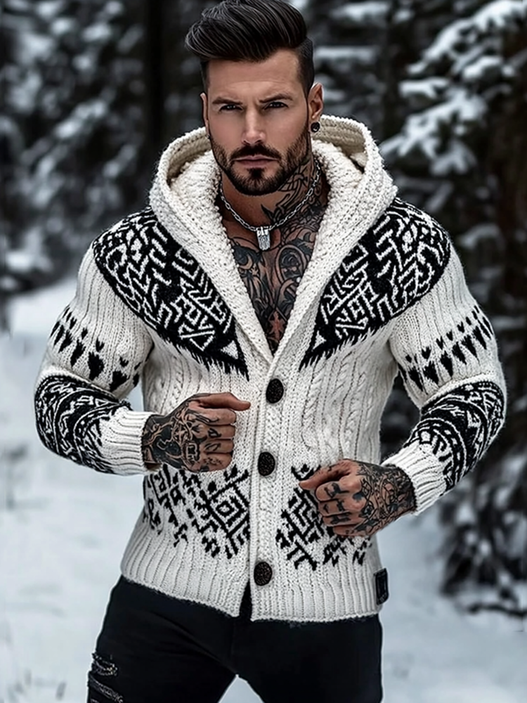 Men's Viking Pattern Jacquard Celtic Button Down Cozy Sweater
