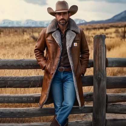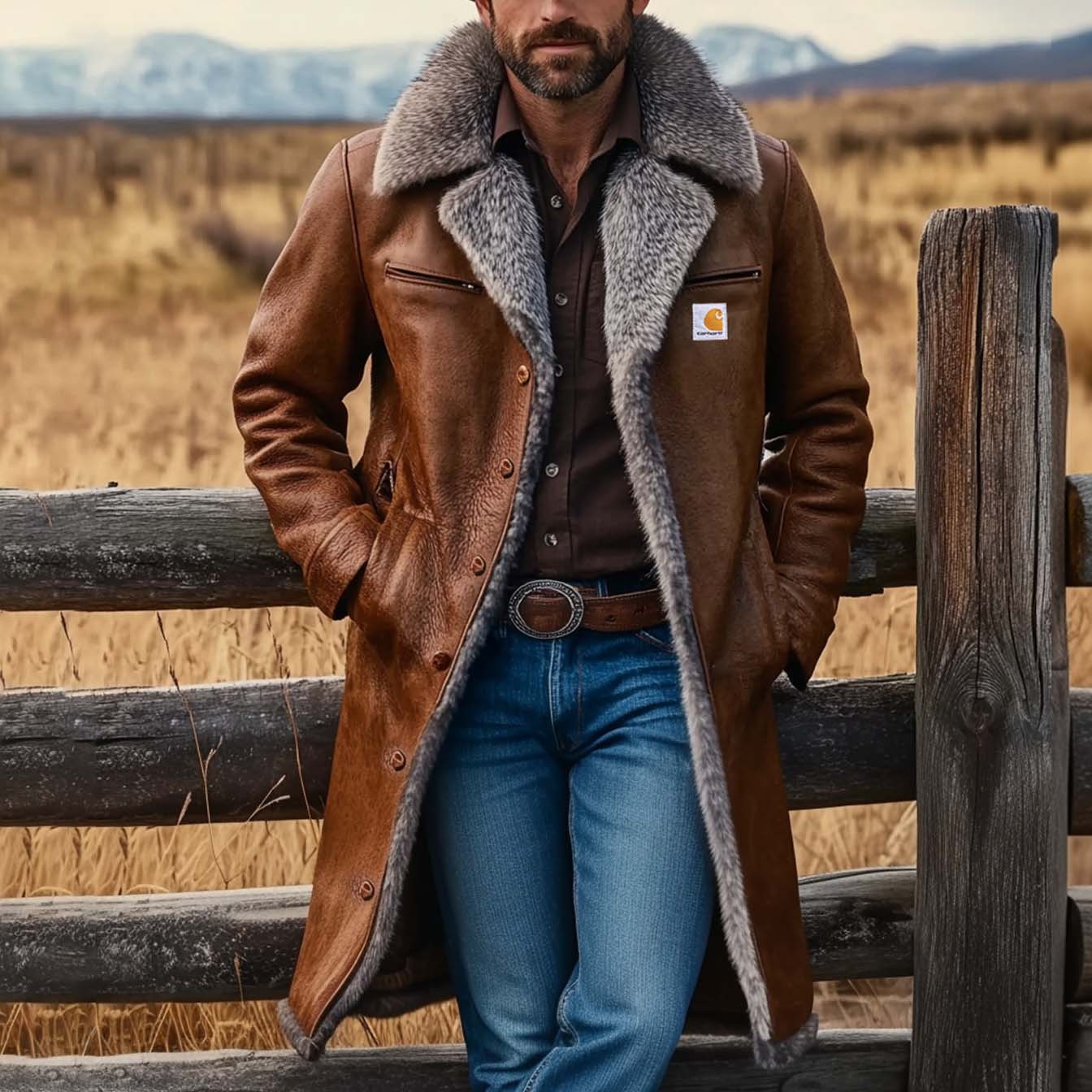Men's Vintage Leather Zip Pocket Shearling Fleece Wool Fur Lapel Collar Mid-Length Coat Sherpa Lined Jacket
