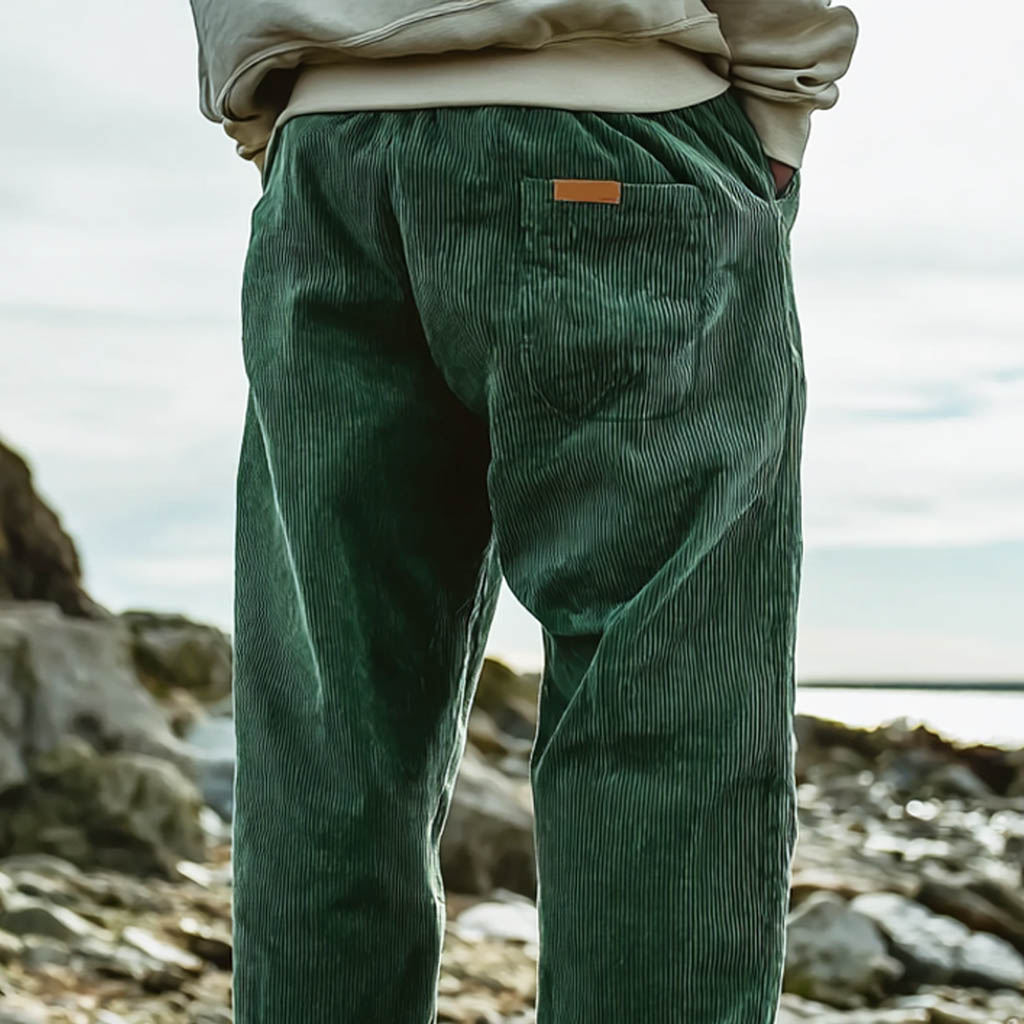 Men's Vintage Surf Dark Green Corduroy Multi-Pocket Casual Elastic Drawstring Pants Trousers
