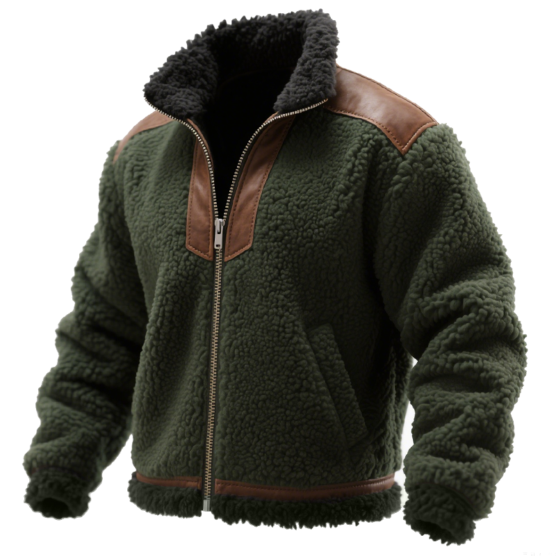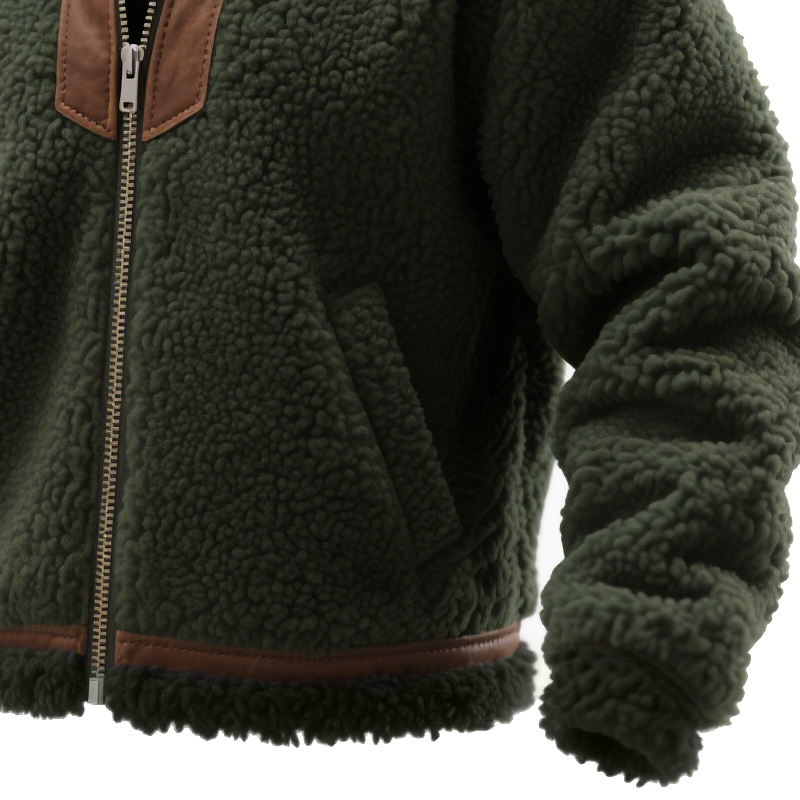 • Design Elements: Zipper closure, leather accents on shoulders and cuffs, fleece texture