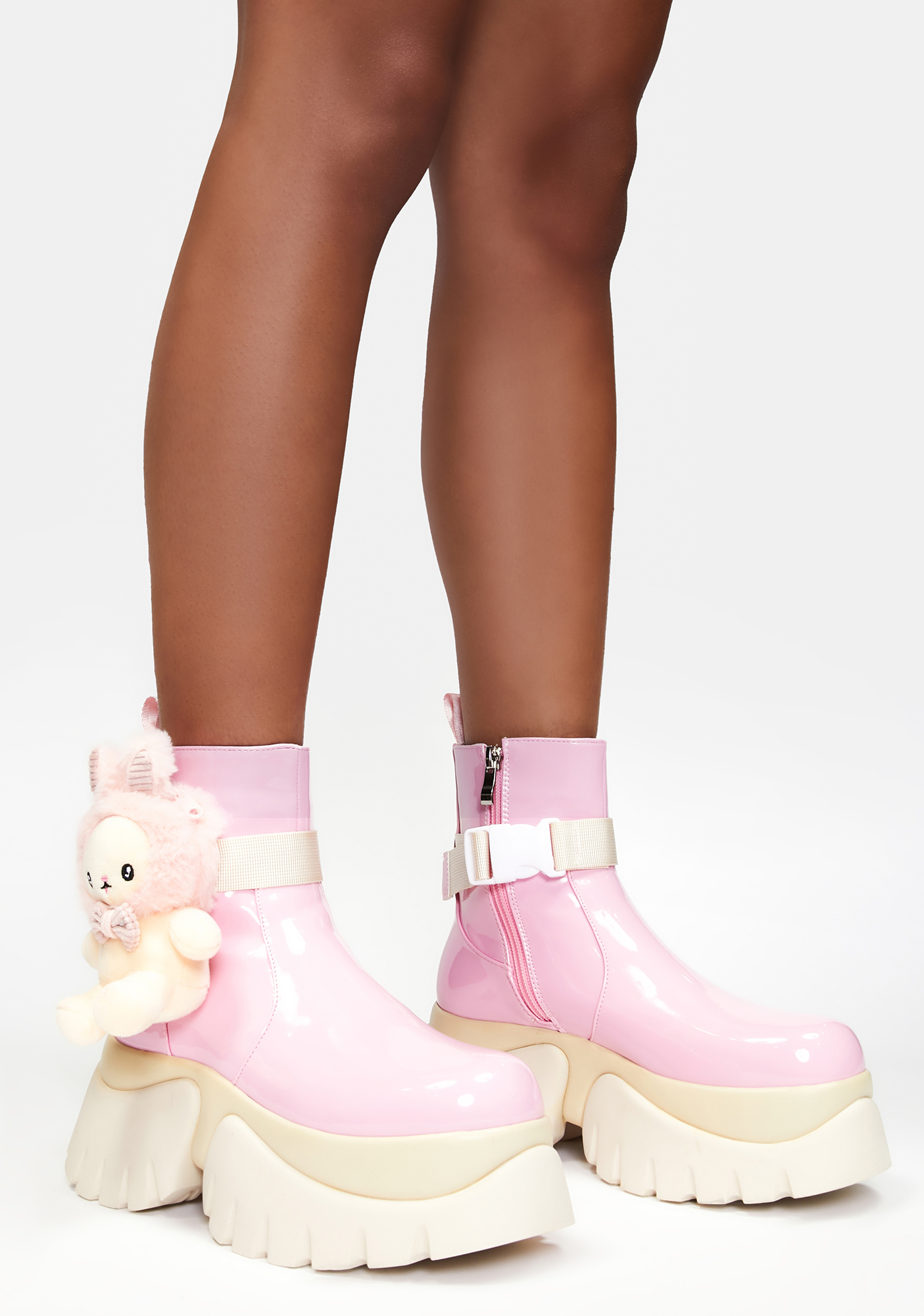 My Pink Melody Platform Boots cuz you’re the cutest tune stuck in our heads! These chunky platform boots have a patent vegan leather construction, side zip closures, and a detachable plush teddy with a super secret zip pocket.