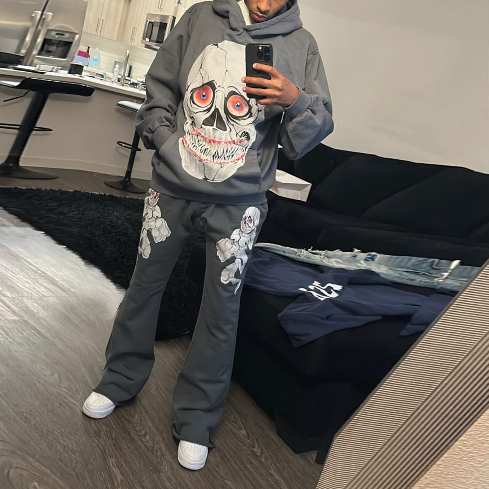 Personalized street style retro skull print hoodie set