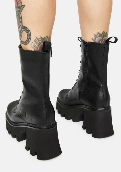 Rain Chunky Platform Ankle Boots have a smooth vegan leather construction, lightweight treaded platform soles, chunky block heels, lace up fronts, and back pull tabs.