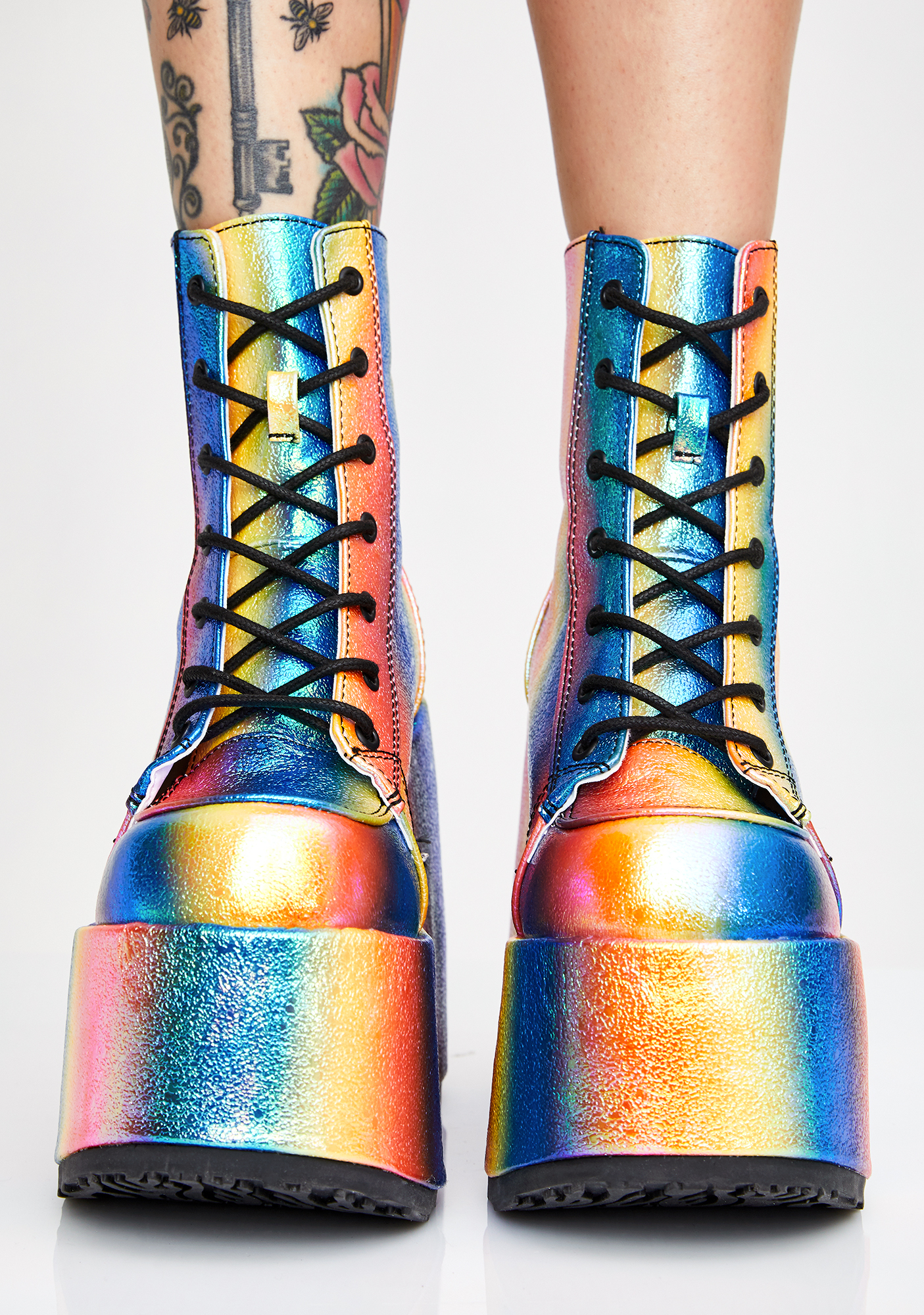 Rainbow Rave Royalty Platform Boots should we curtsy? These crazy bright rainbow boots have an ultra thicc platform sole ‘N heel, an iridescent shimmer material, adjustable lace-ups and back zip closures.