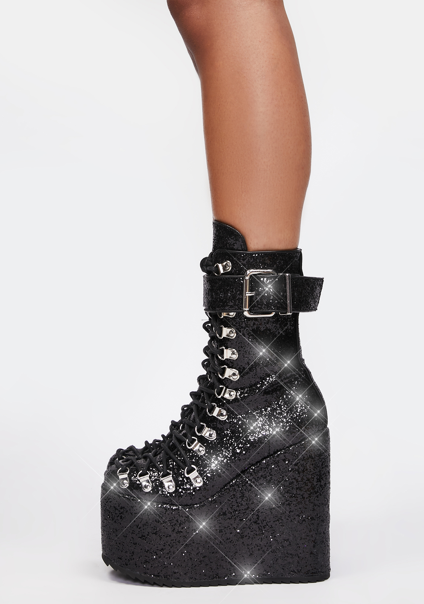 Sparkle Traitor Boots cuz you’re glam but deadly. These wedge platform boots have a vegan leather construction with glitter uppers, adjustable D-ring lace-ups that run all the way down to the toes, buckle wrap straps, and side zip closures.