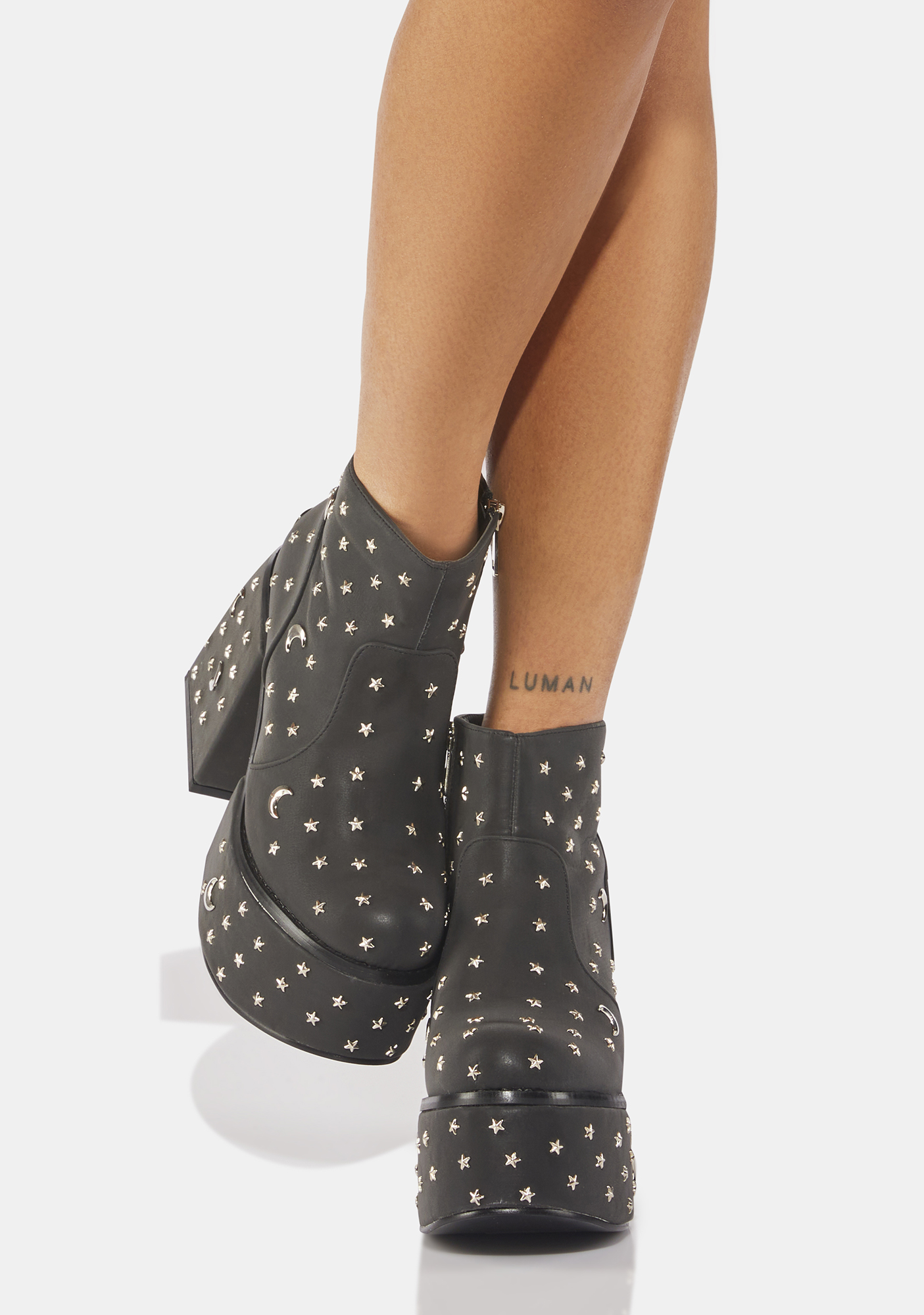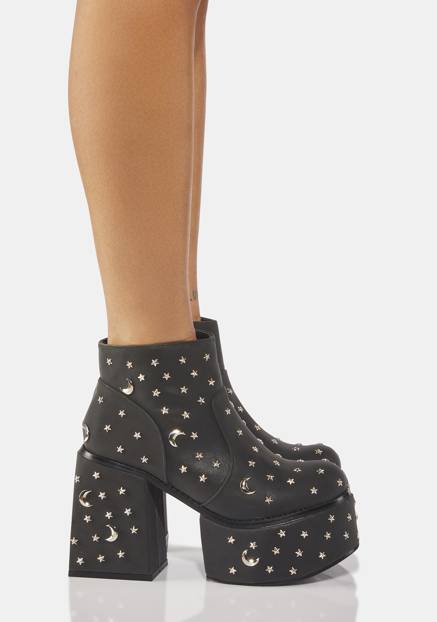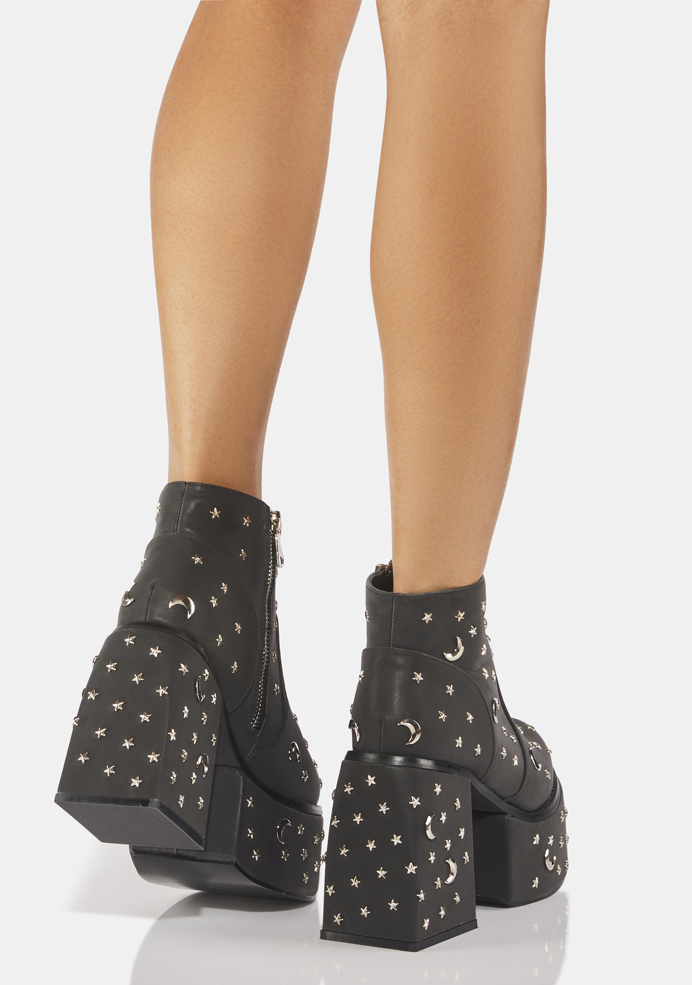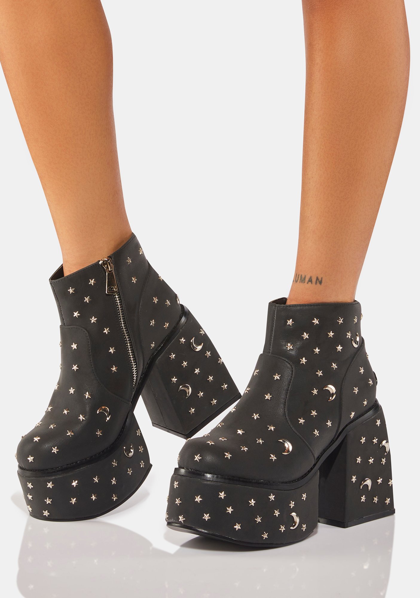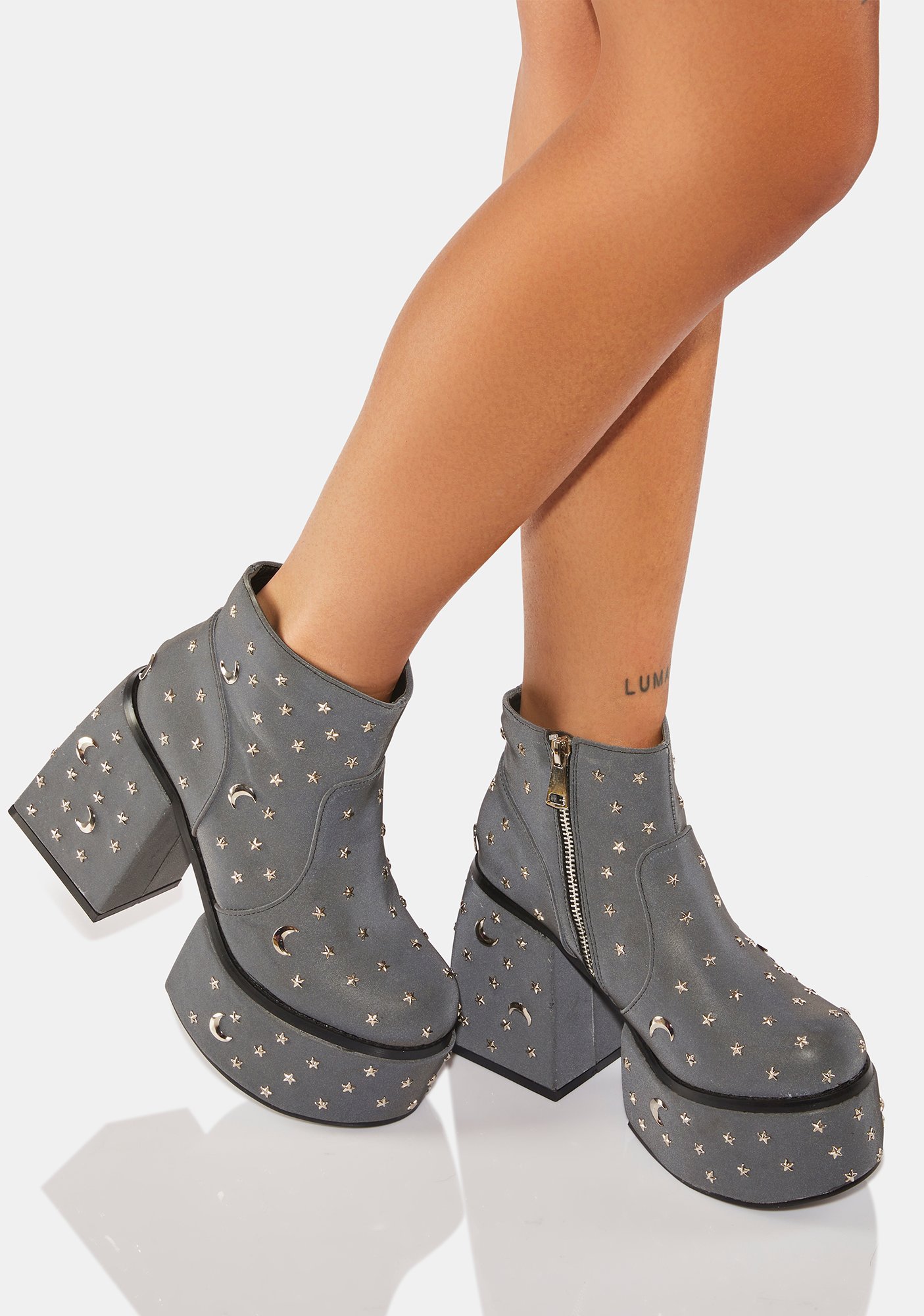 Star Ice Platform Boots fly me to the moon, and we'll land among the stars. These boots have a chunky heel \u0026 platform sole, a low ankle rise, a zipper closure on the inner ankle, star and moon studs all over, and a holographic design.