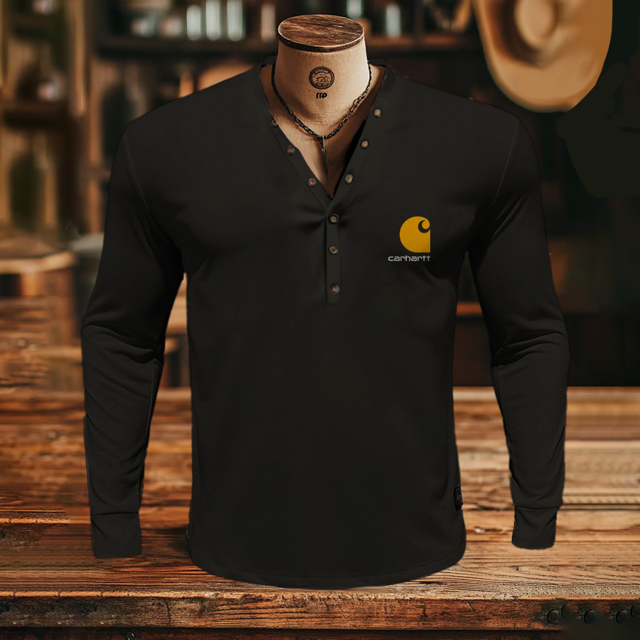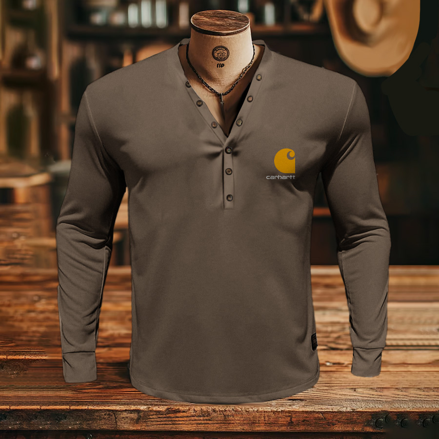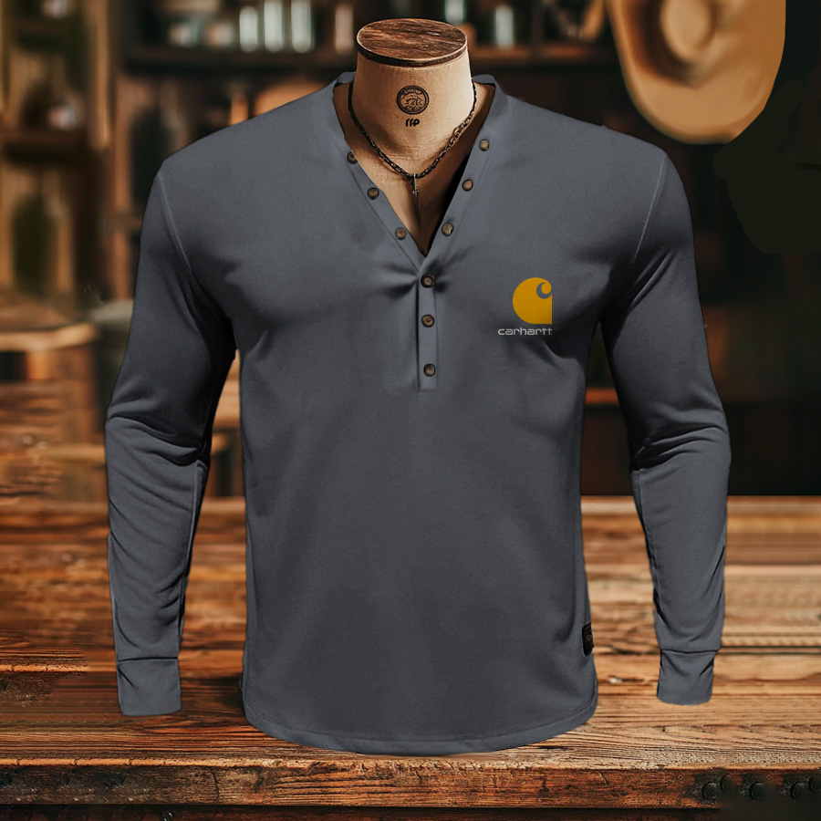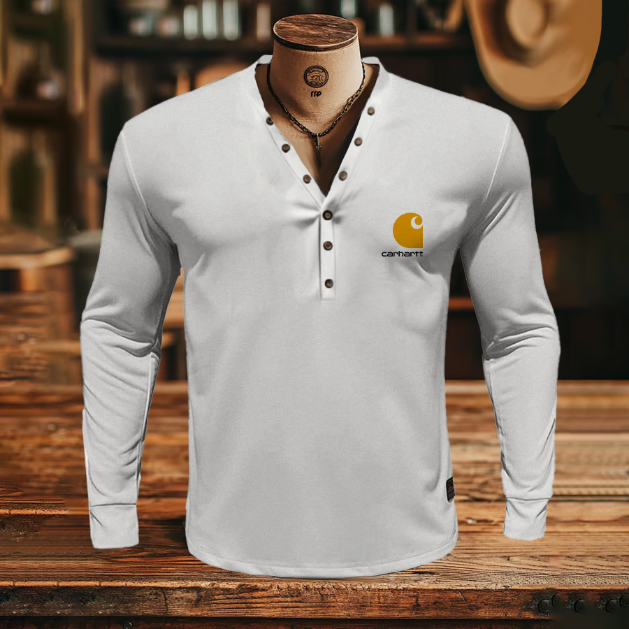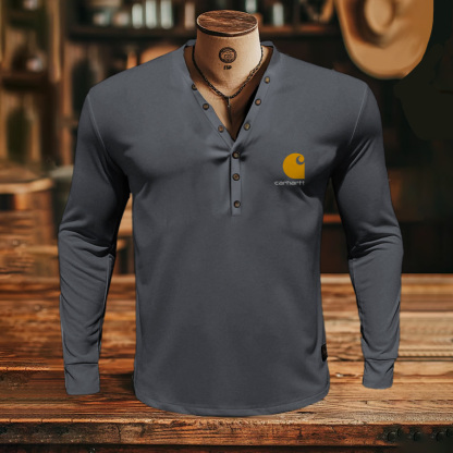 • Design Elements: Chest logo patch, button-down placket, classic henley neckline