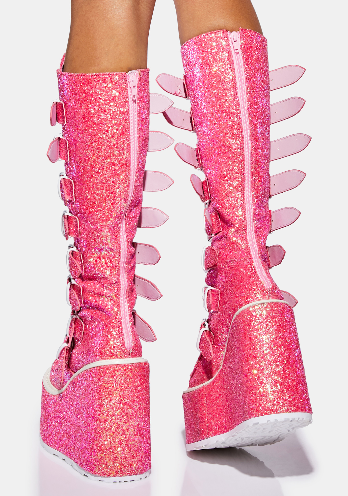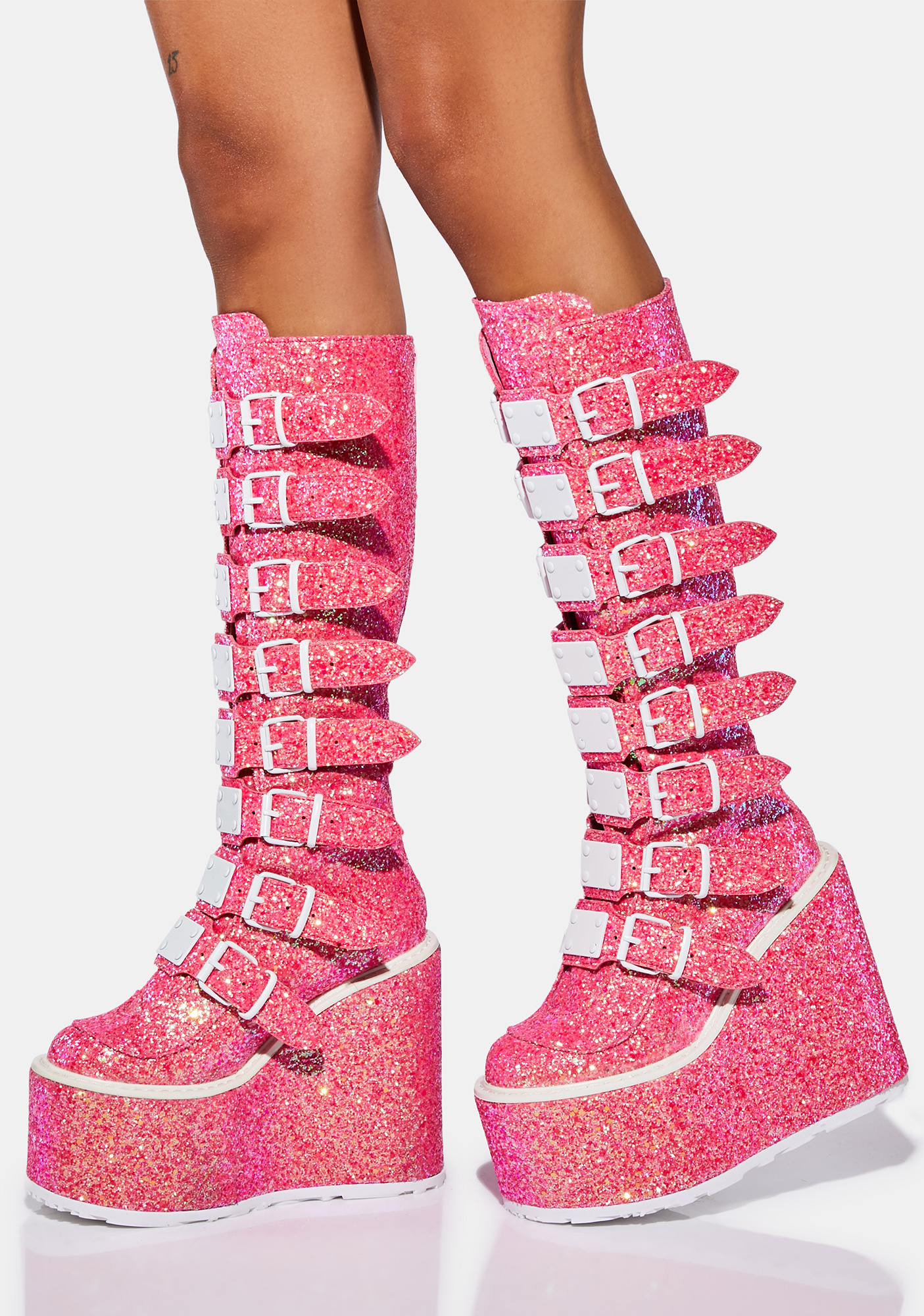 UV Pink Glitter Trinity Boots cuz you’re from a different planet. These knee high platform boots have a UV reactive chunky glitter construction, tons of adjustable buckle straps with metal plate details, and back zip closures.