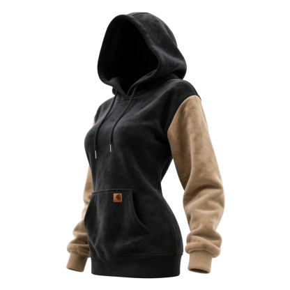 Women's Retro Western Contrast Panel Suede Long Hooded Sweatshirt Dress