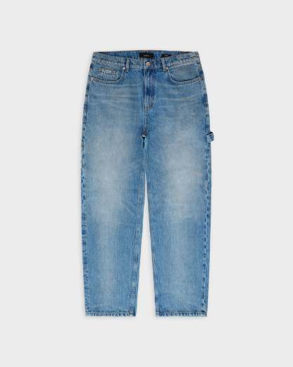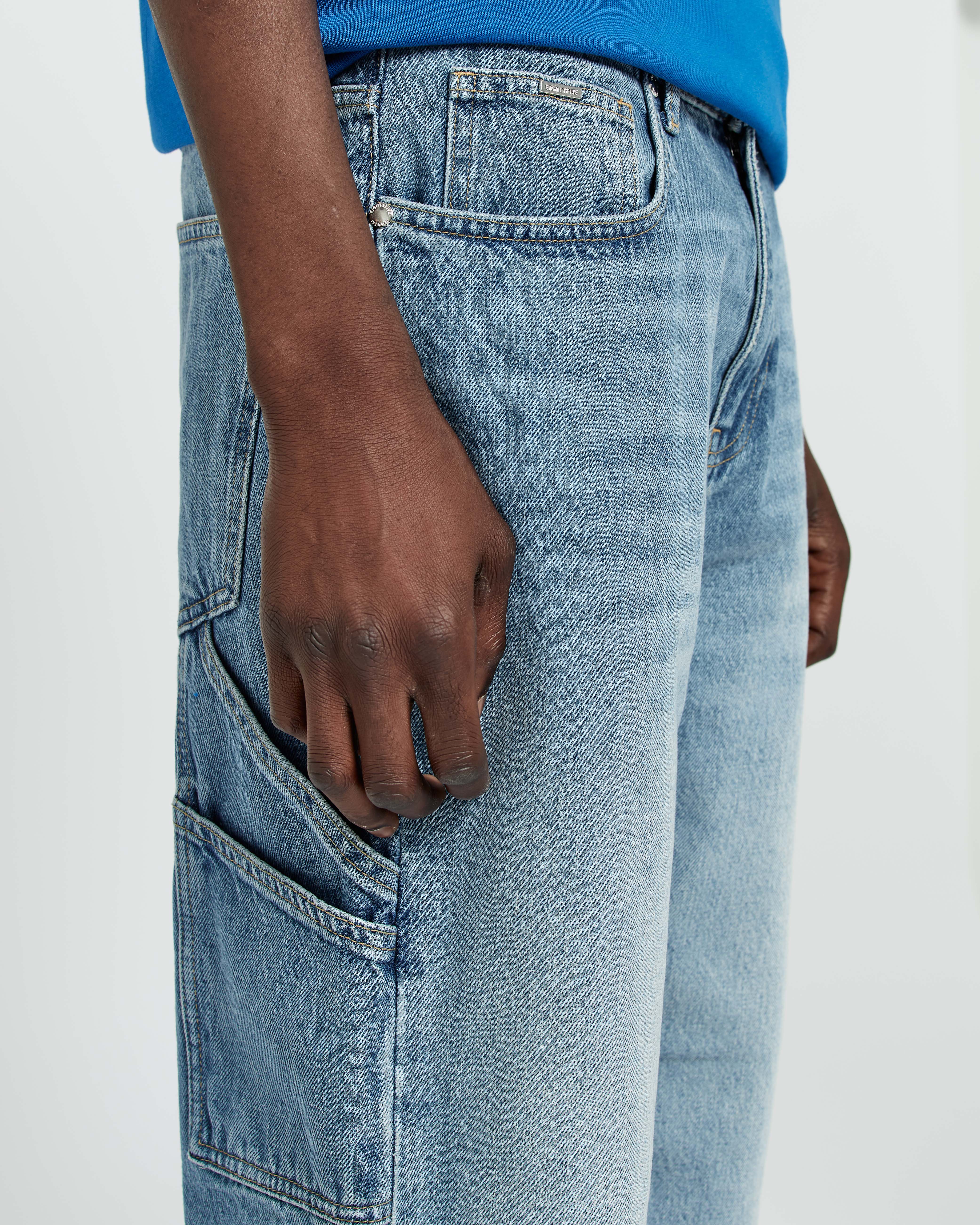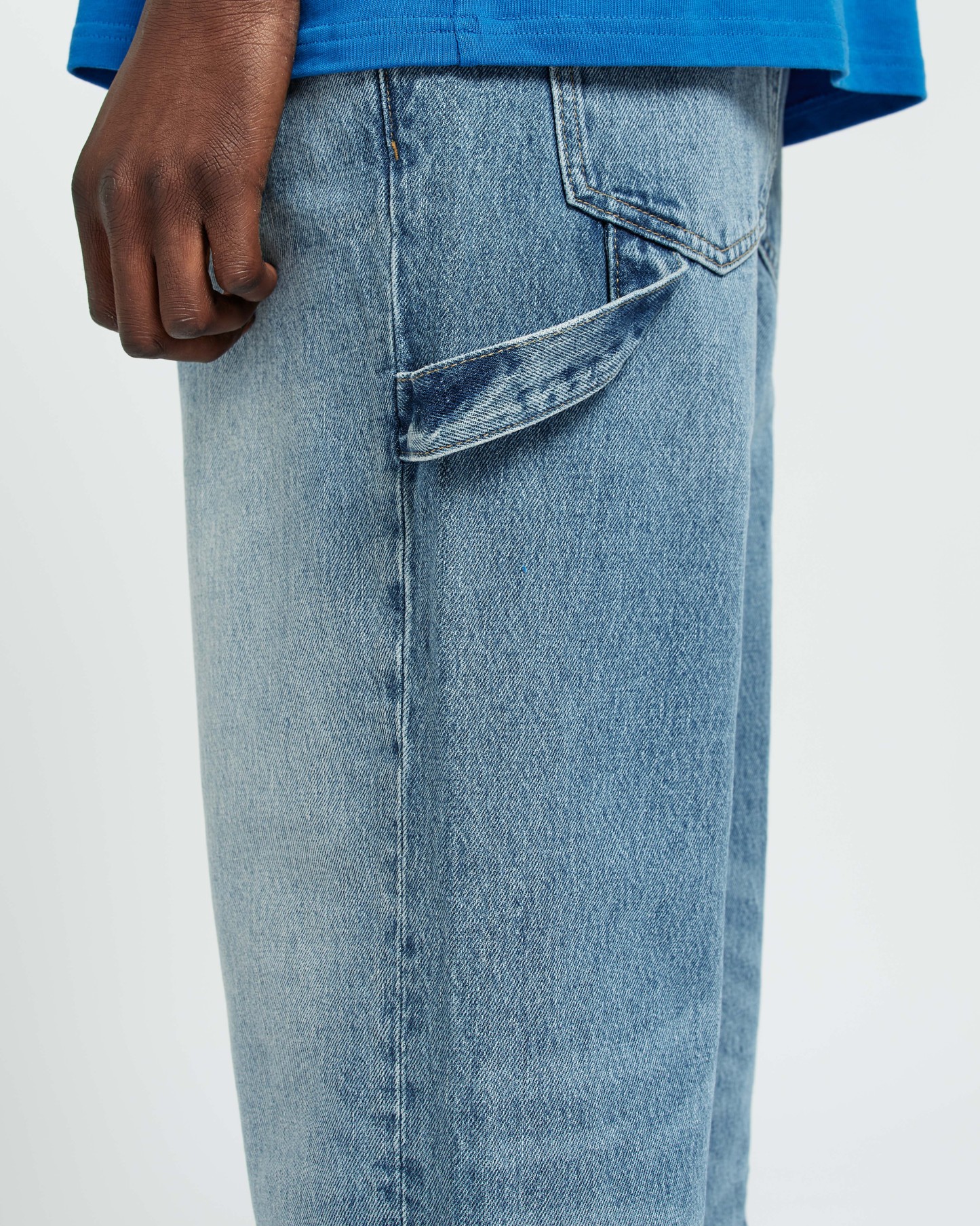 Jeans Light Wash Blue Baggy Fit Carpenter Detail, Loop Metal Emblem 100% cotton, The model is 188cm tall, weighs 74kg and wears size 32 85S-411-27